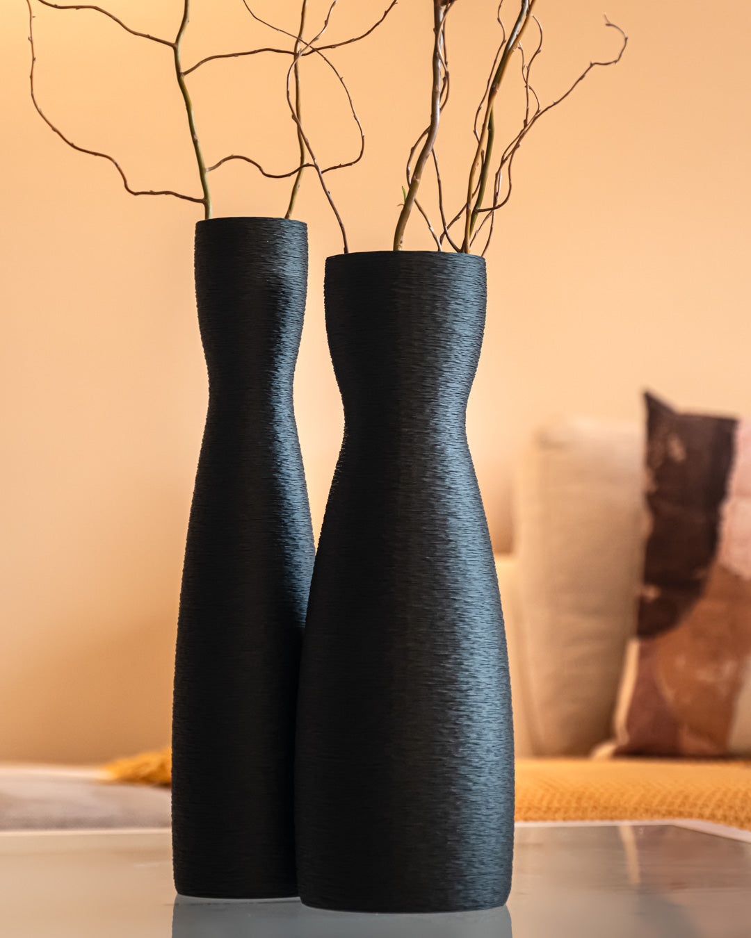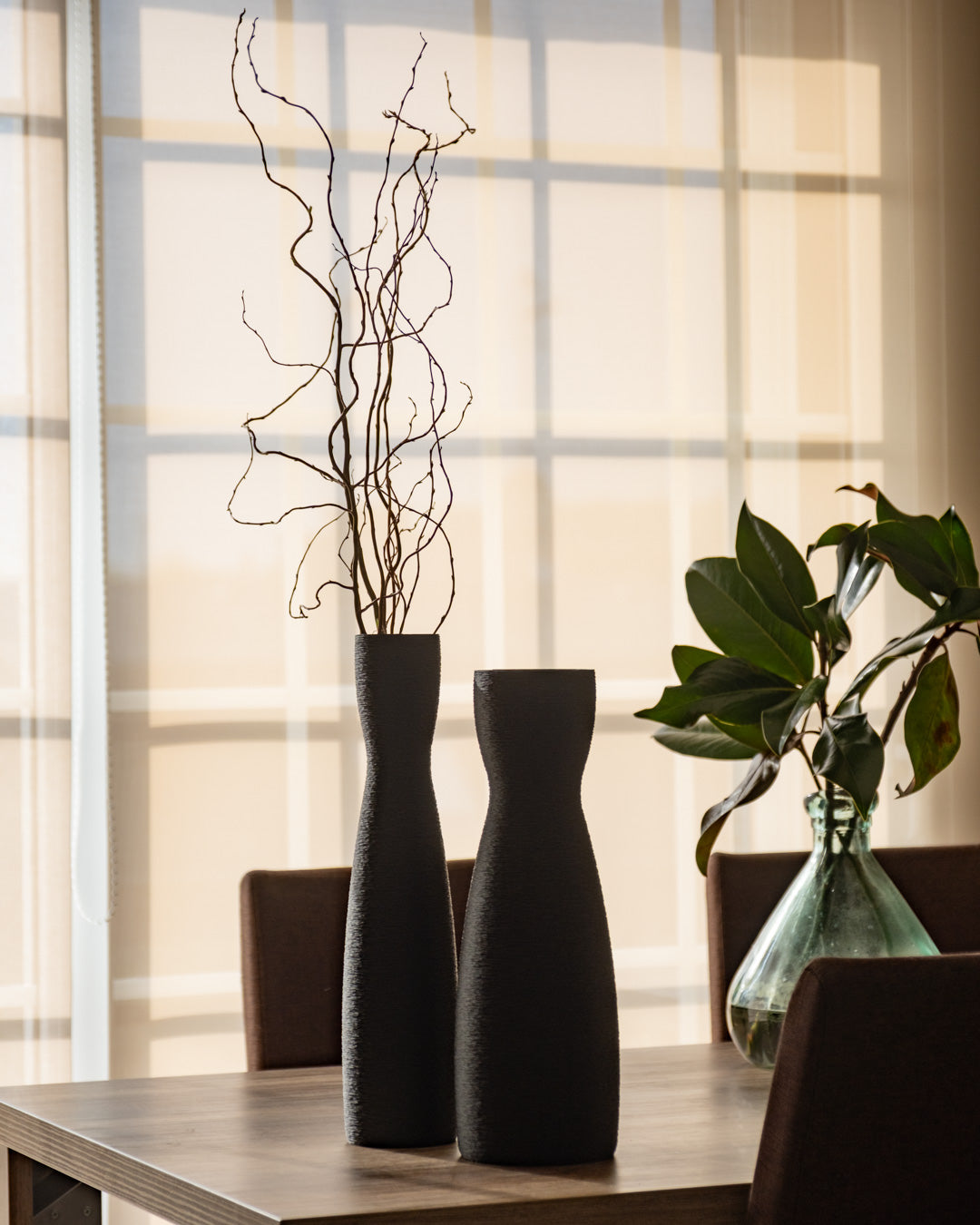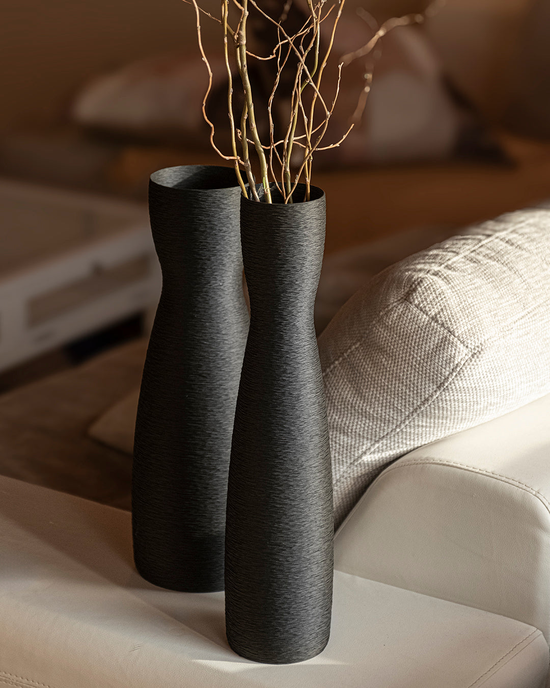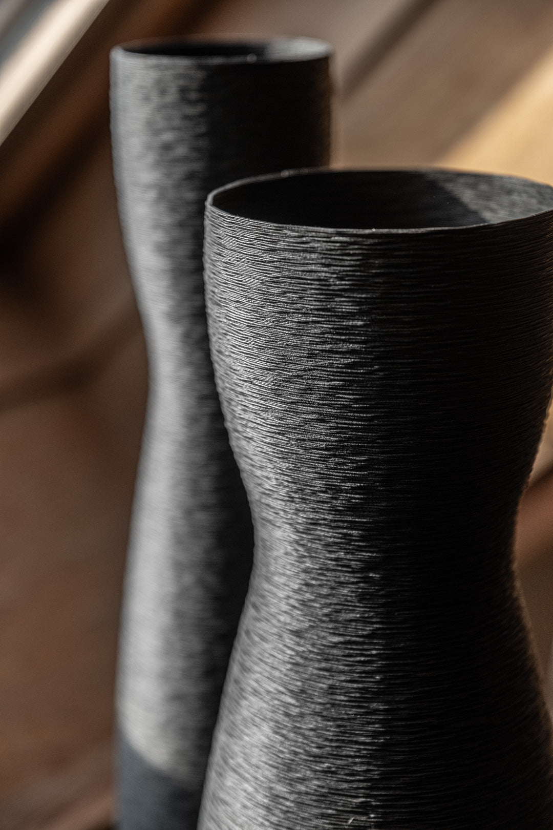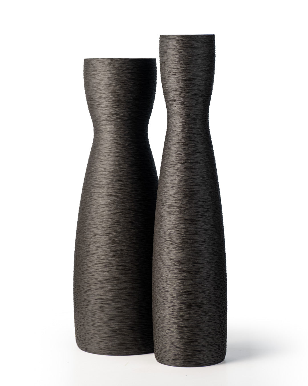 Cada florer s'imprimeix en 3D amb un patró de capes molt fi que genera una textura gairebé tèxtil, visible sobretot quan la llum arriba en diagonal. La forma és neta, sense ornaments, perquè la silueta i les ombres ho siguin tot: perfectes per lluir soles o en parella sobre una taula, aparador o prestatgeria.