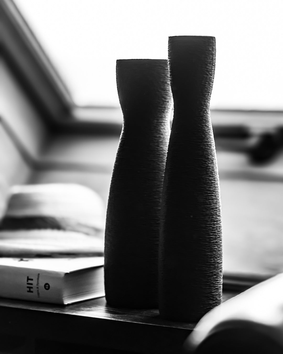 La col·lecció Zénit explora la verticalitat i el joc entre llum i ombra a través de dues siluetes negres, altes i serenes. Dos perfils que dialoguen entre si: un de més esvelt, un altre de més estable, com dues columnes silencioses a l'espai.
