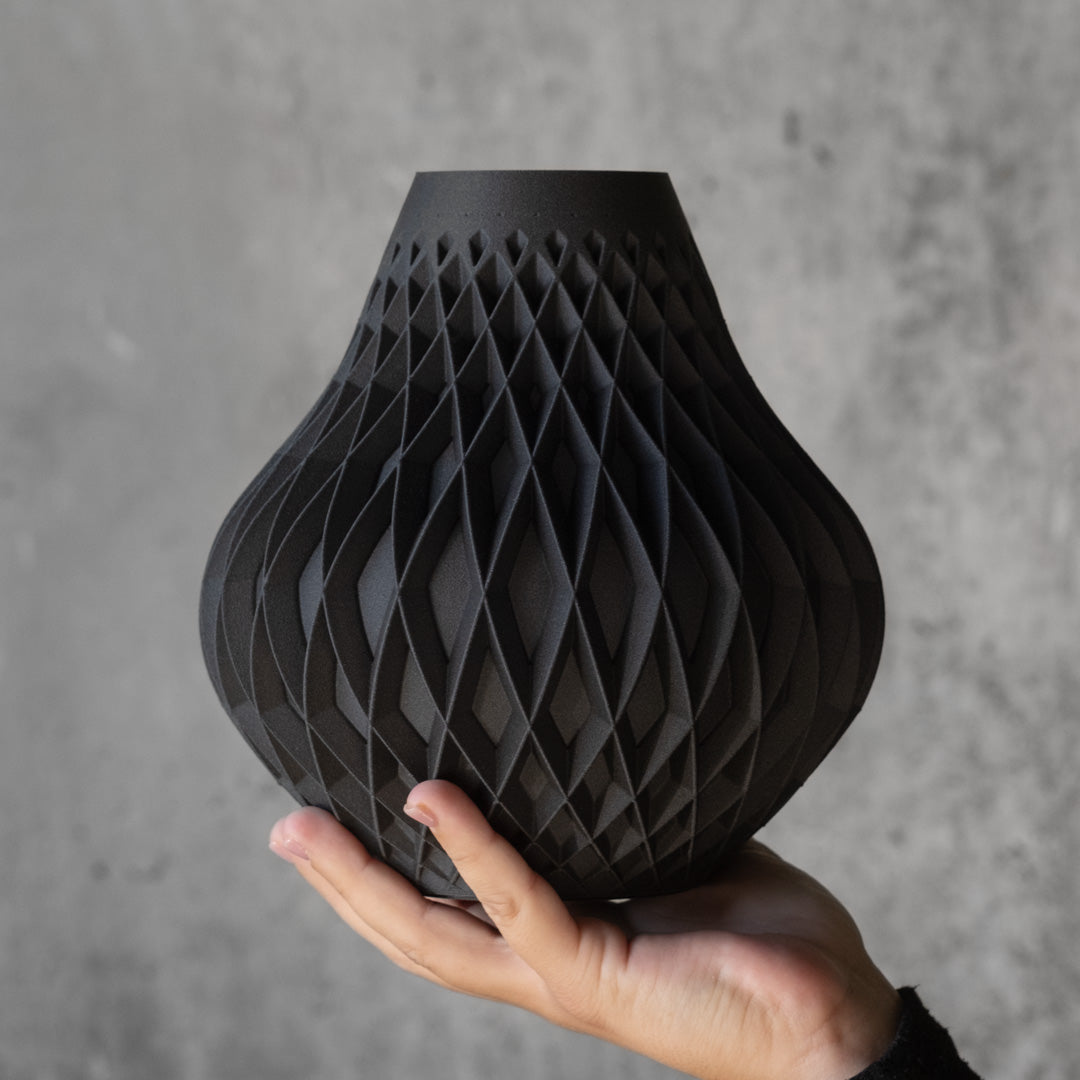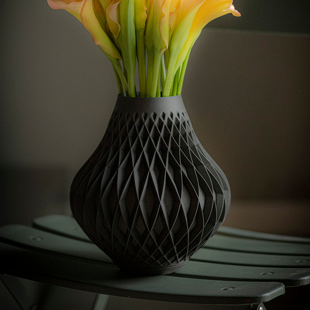 Els nostres gerros estan impresos en 2 peces, l'interior està impermeabilitzat, el que permet utilitzar-los amb flor fresca sense cap risc de fuga, hem comptat amb assessorament de professionals del sector pel seu disseny. El nostre patro romboïdal caràteristic adquireix en aquesta peça un caràcter determinant.
