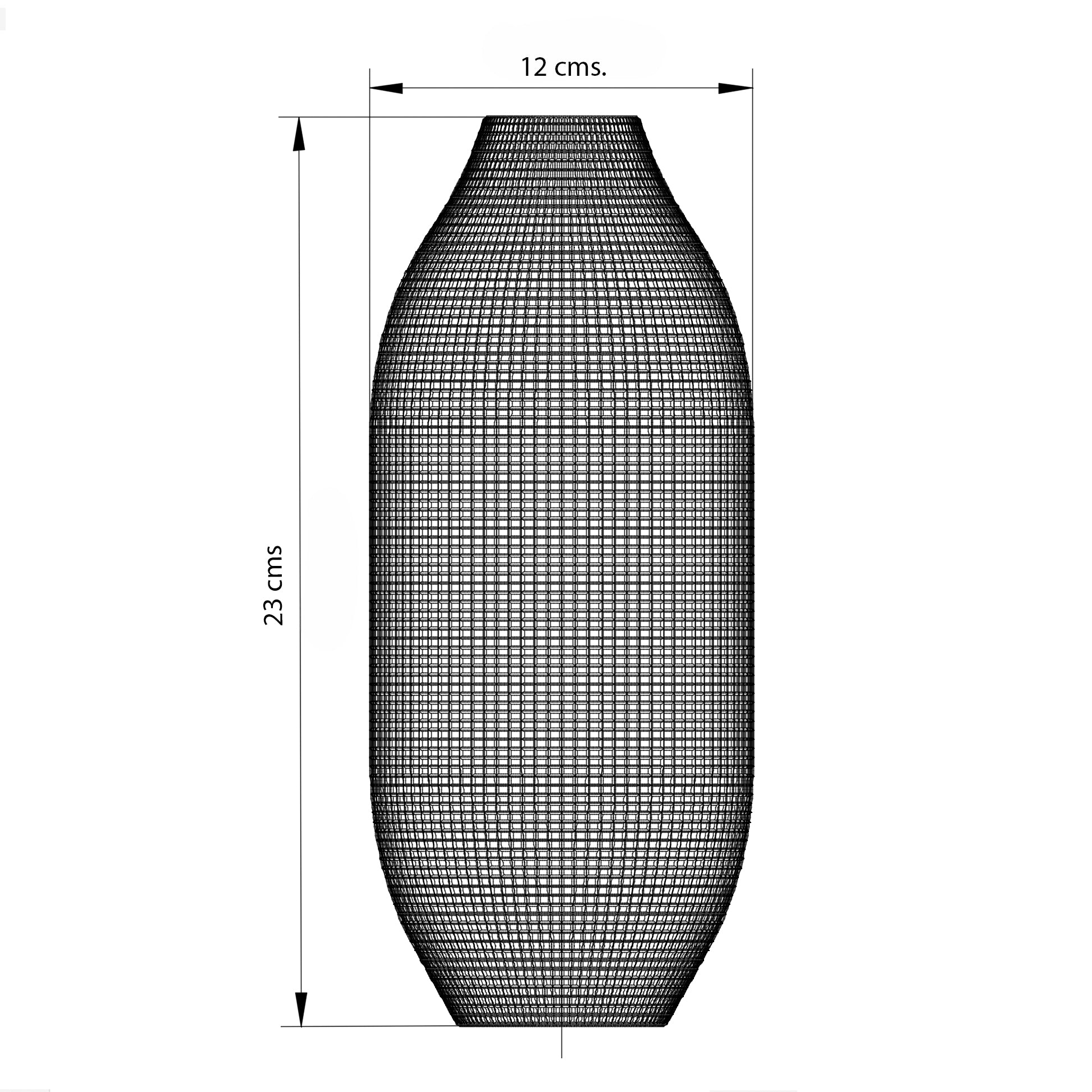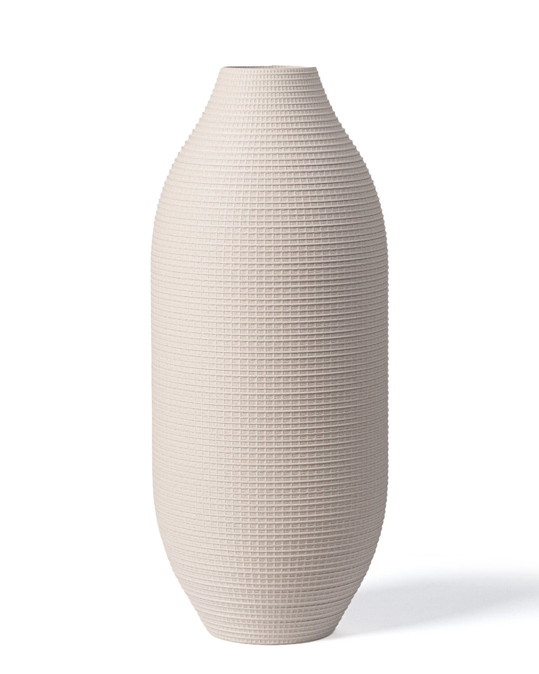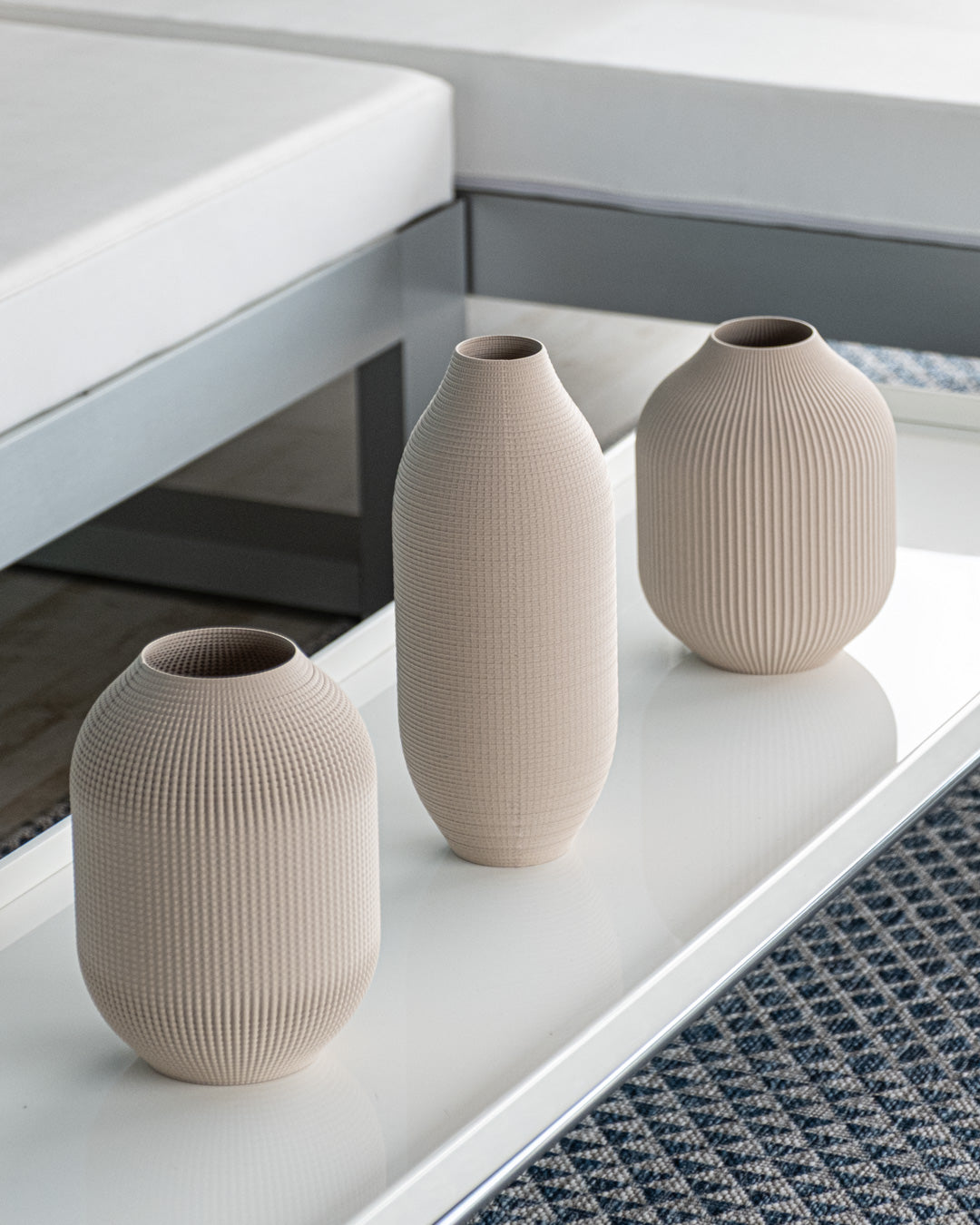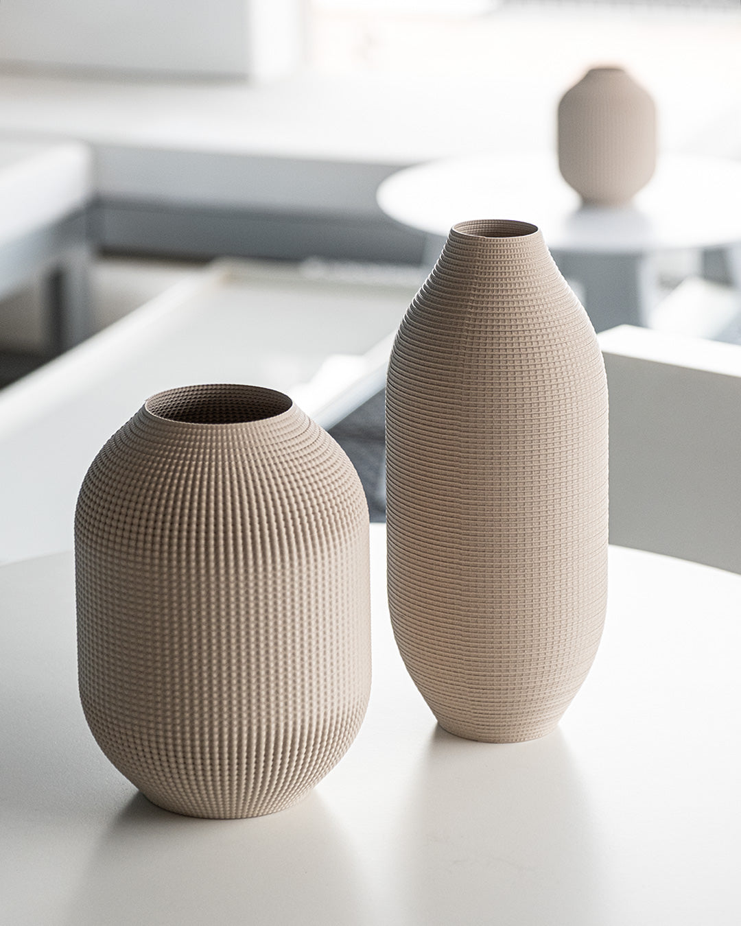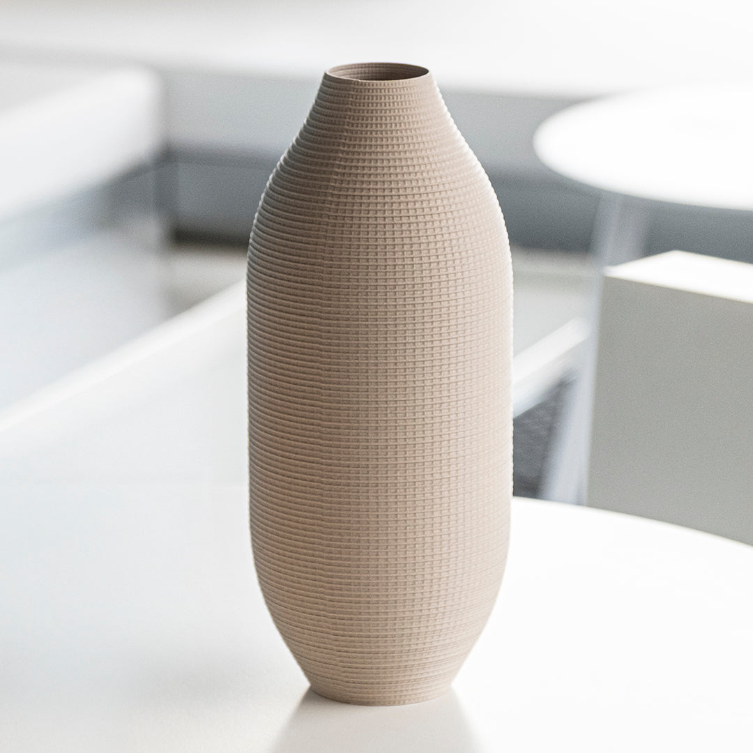 Perfil alto y estilizado con líneas horizontales finas que ascienden creando bandas de luz y sombra. La pieza más arquitectónica de la colección, de presencia escultórica y gesto minimalista. Impreso en 3D con PLA Wood, un material biodegradable y compostable con un 40% de fibra de madera natural.