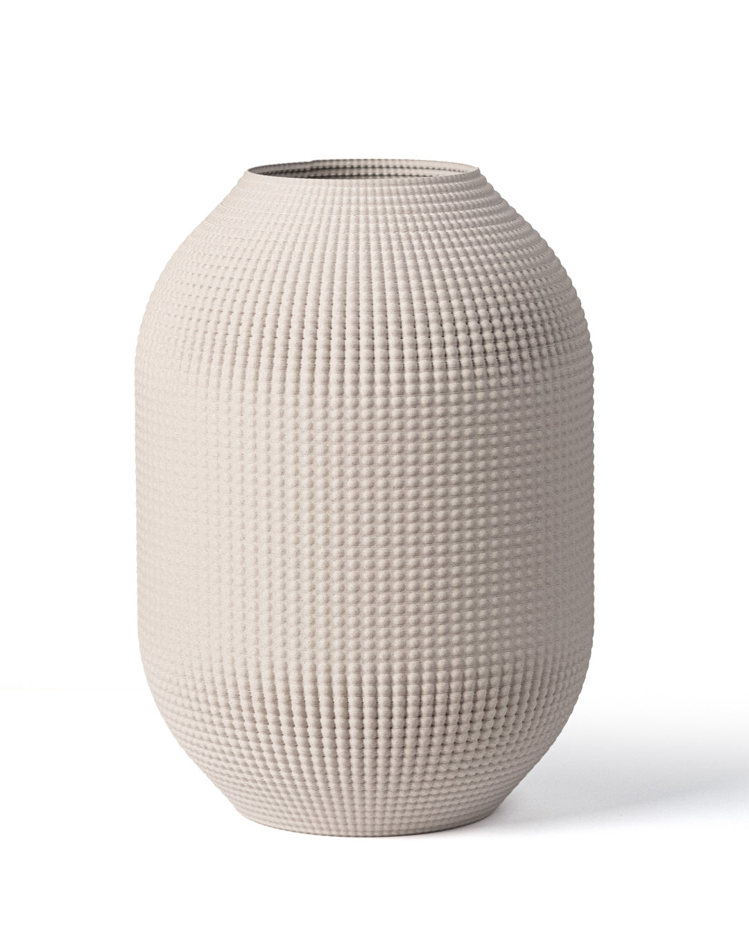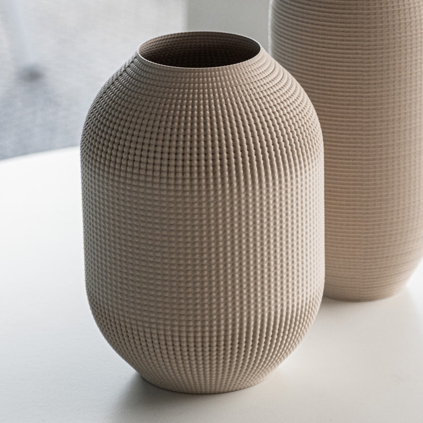 Forma ovoide equilibrada con textura de puntos en relieve que crea un juego de luz y sombra sutil. Una pieza de presencia serena y carácter minimalista. Impreso en 3D con PLA Wood, un material biodegradable y compostable con un 40% de fibra de madera natural