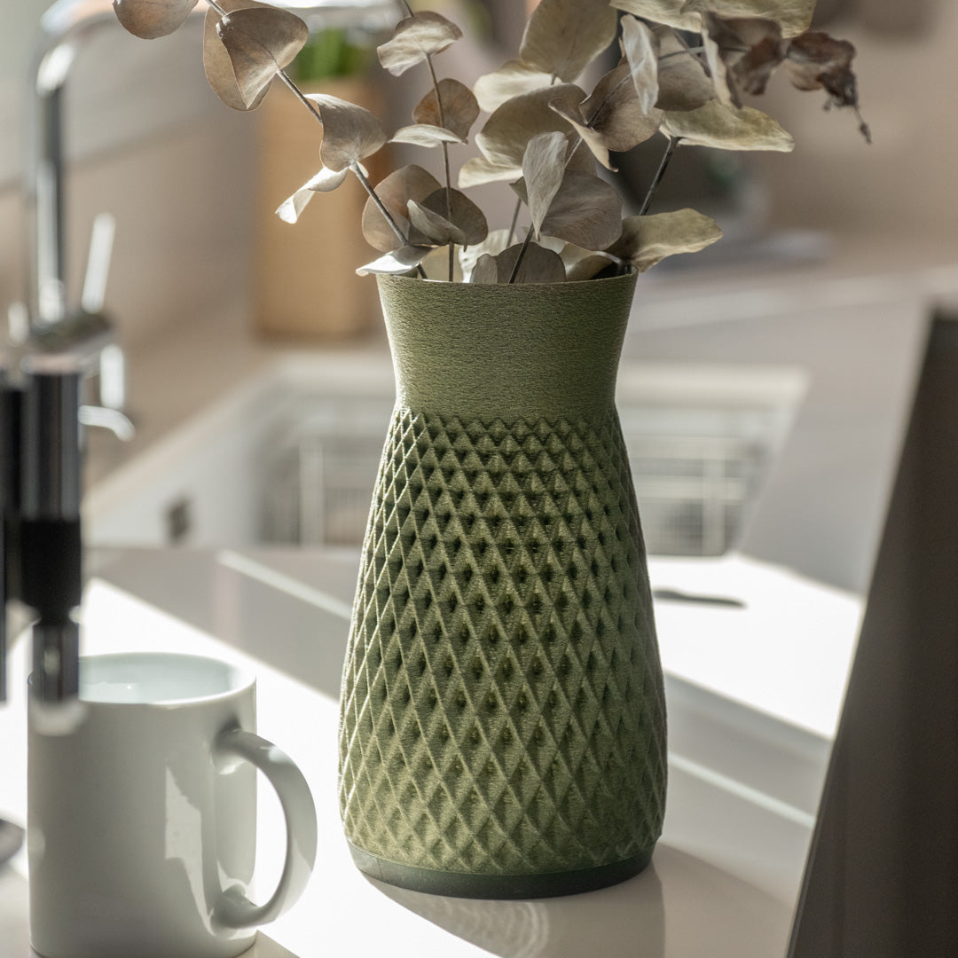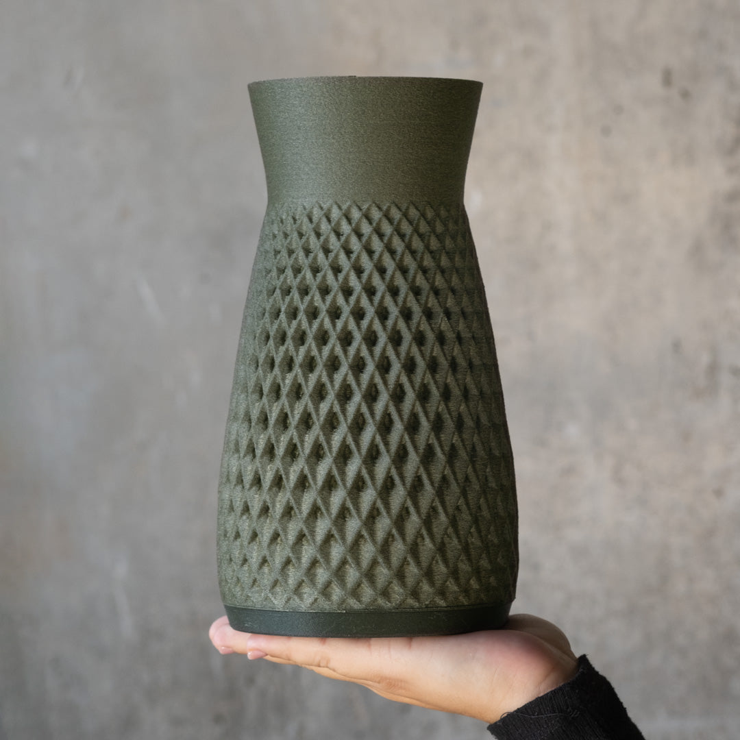 Disseny clàssic reinterpretat amb el nostre patró de rombs minimalista. Imprès en 3D amb PLA Algues, un material biodegradable i compostable amb un 20% d’algues naturals i 0% colorants.