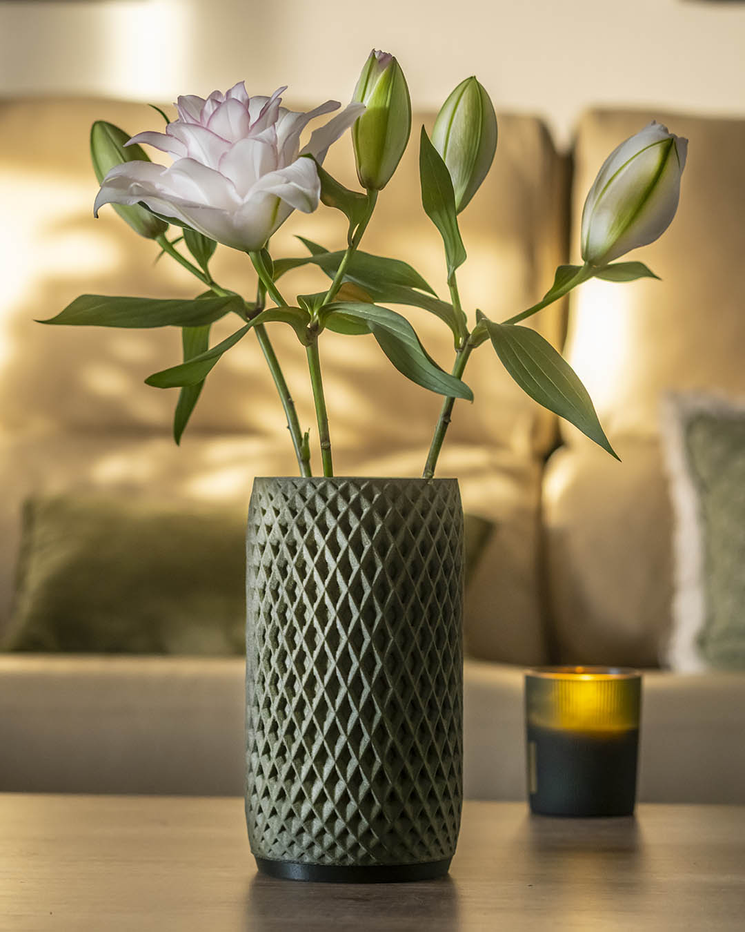 Diseño clásico reinterpretado con nuestro patrón de rombos minimalista. Impreso en 3D con PLA Algae, un material biodegradable y compostable con un 20% de algas naturales y 0% colorantes.