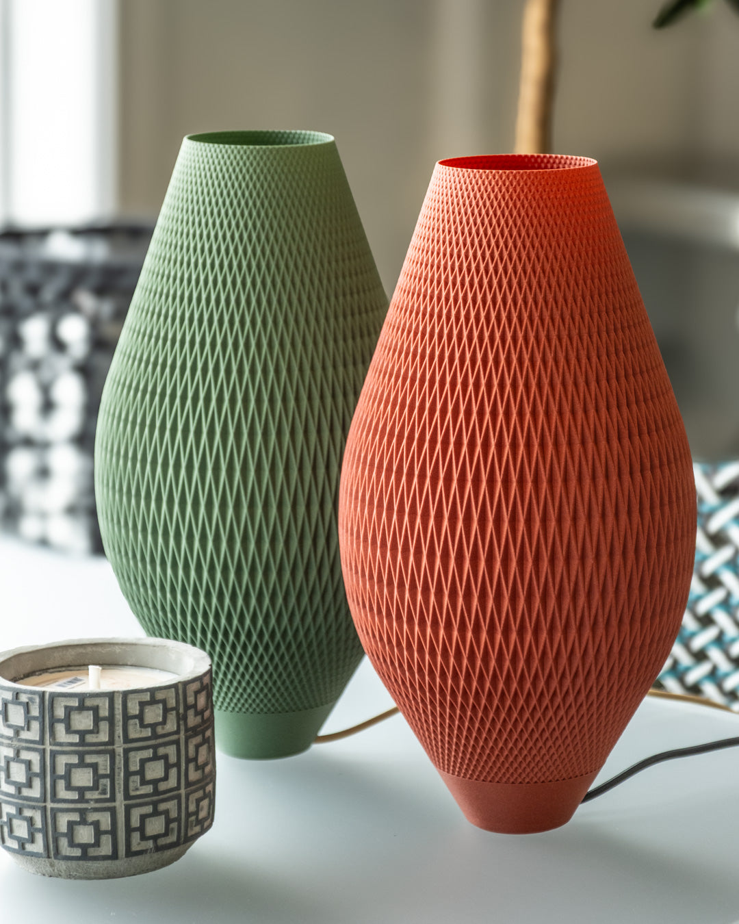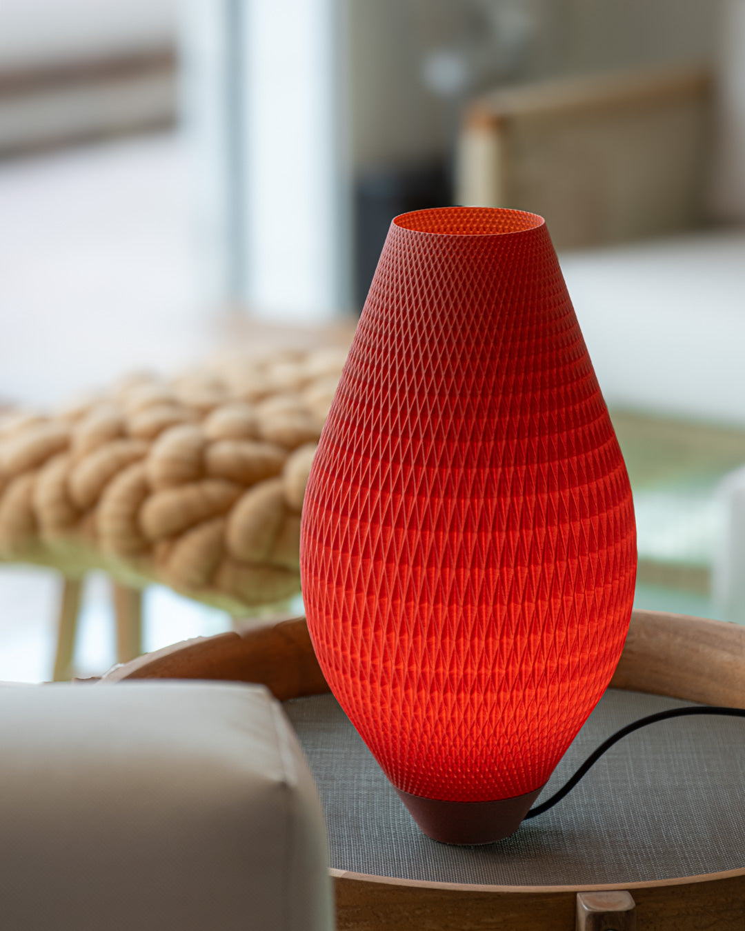 Cada color dibuja una atmósfera distinta: el ocre cálido acoge como un sol de tarde, el coral tiñe el aire de calidez íntima, el verde sage invita al sosiego natural, el rojo intenso late con carácter vibrante. No buscan iluminar con fuerza, sino crear ambientes, vestir el espacio de color y textura, habitar como esculturas que respiran luz.