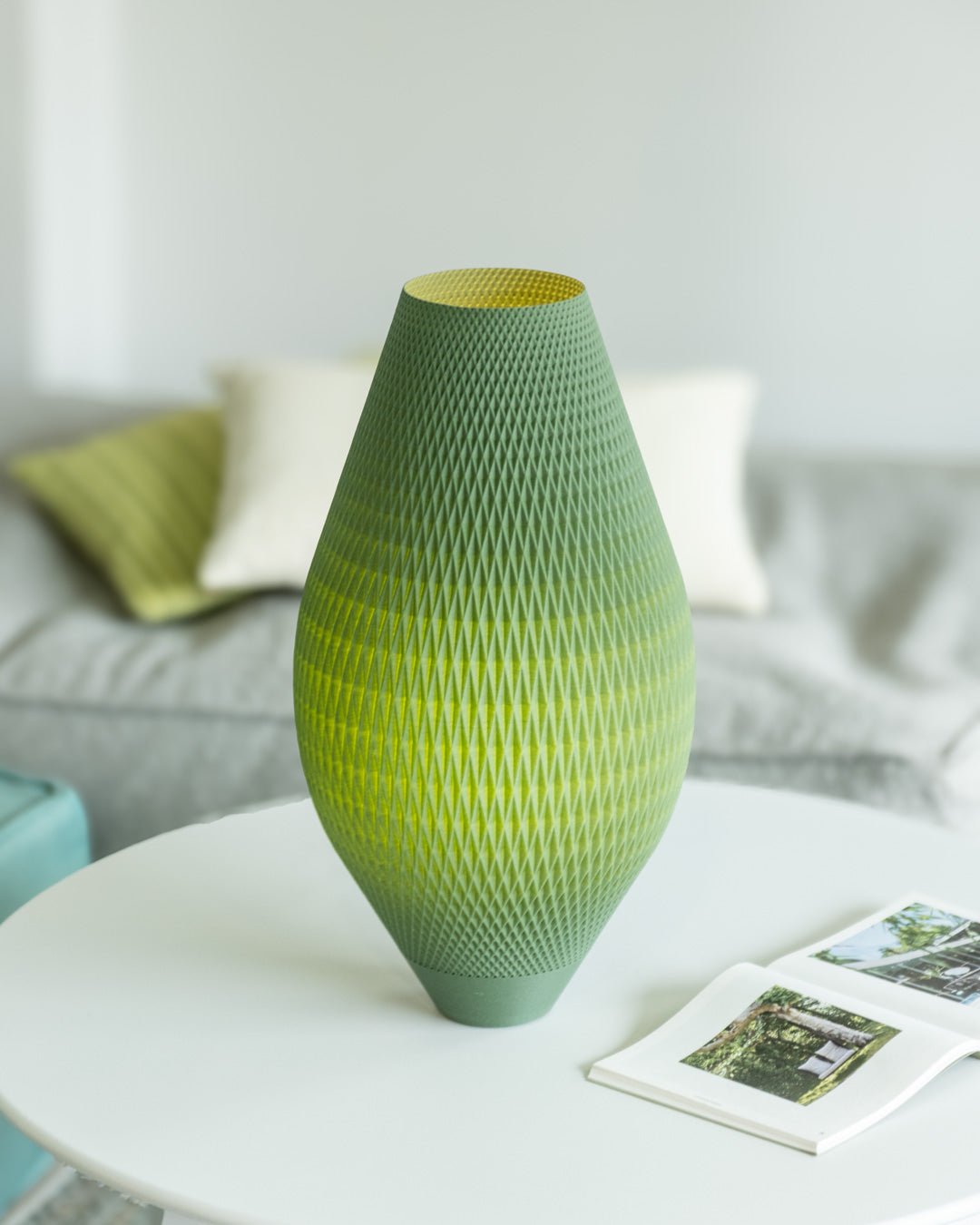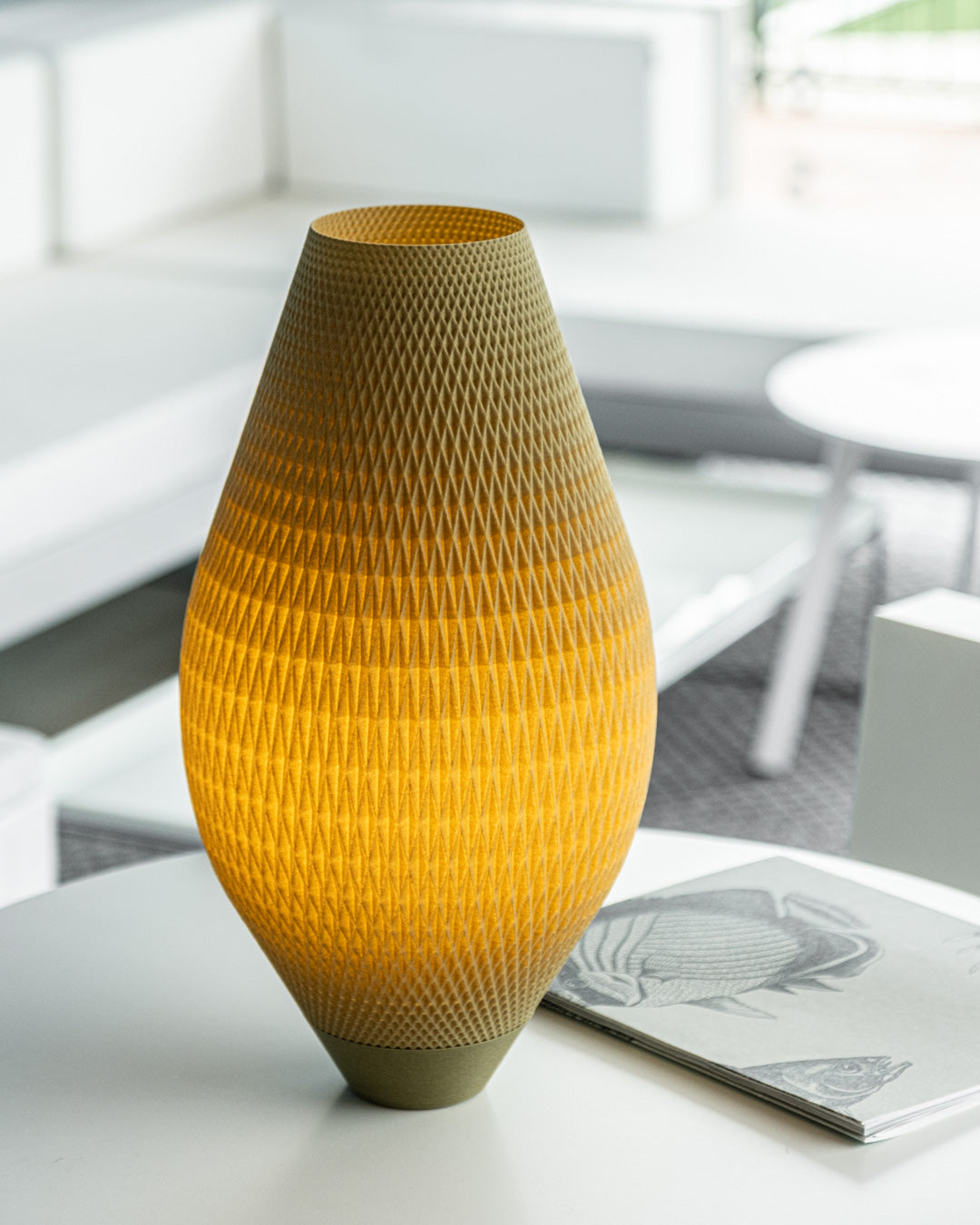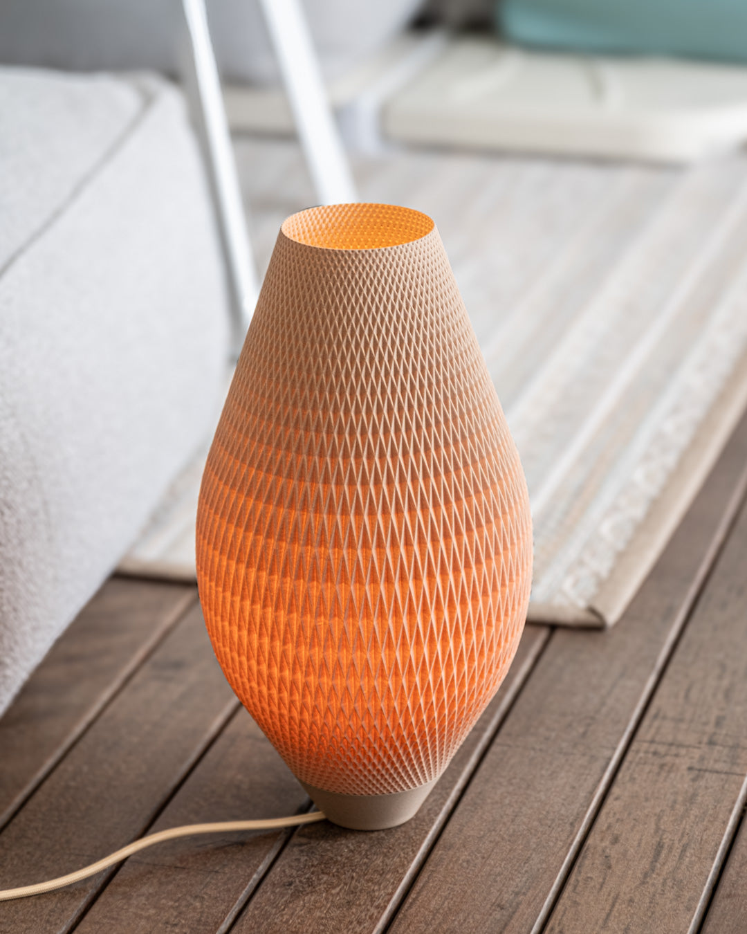 La 101 nace como evolución serena de nuestra 99 clásica. Con 43 cm de altura, su silueta esbelta y ovoide se alza como una presencia luminosa que respira en el espacio. El patrón romboidal calado se convierte en piel traslúcida, dejando pasar una luz difusa y envolvente que transforma el ambiente sin imponerse.